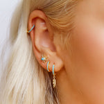 Small dainty simple huggie hoop with unique simulated turquoise & zircon studded design - Add a luxurious and bold look to any outfit with these dainty, glowing eternity huggies. These beauties have just the right amount of sophistication and sparkle. Crafted in Sterling silver, this earrings are sure to impress on any occasion. This timeless and modern hoop earrings are plated 18K gold.. let these beautiful earrings adorn you and complement your fashion sensibilities. These earrings come complete with click-in clasps. Handcrafted in sterling silver.