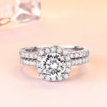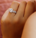 This Round Halo Diamond Engagement Ring Wedding Band Set showcases a 1.5 ct engagement ring with round-cut diamond amplified by a fiery halo of starlight white diamonds that surround the diamond at the girdle adding sparkle and fire while giving the diamond a much larger appearance in size. The halo floats above a delicate studded zircon studded shank creating a gorgeous and breathtaking ring set that is sure to take her breath away. A complimenting studded wedding band stacks flush against the engagement ring for a complete and uniform Bridal Ring Set.
