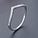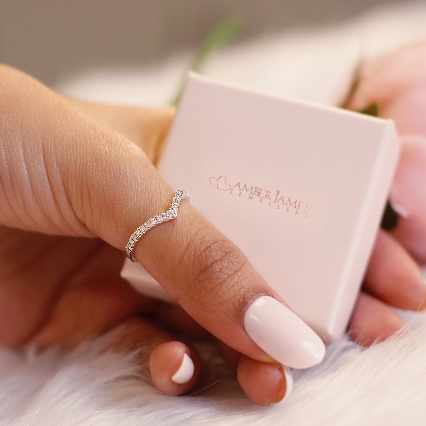 Stunning wish bone ring beautifully designed and detailed in our Amberjames studio. This superb ring is features shimmering 925 sterling silver that form a chevron shape band design accented with simulated diamonds to present a glamorous look. Add a delicate accent to your look with this stunning wedding band from our collection. A high polish finish completes the band, making it the perfect complement to your engagement ring.