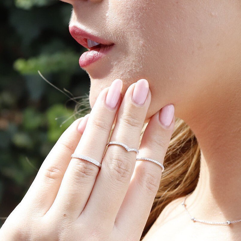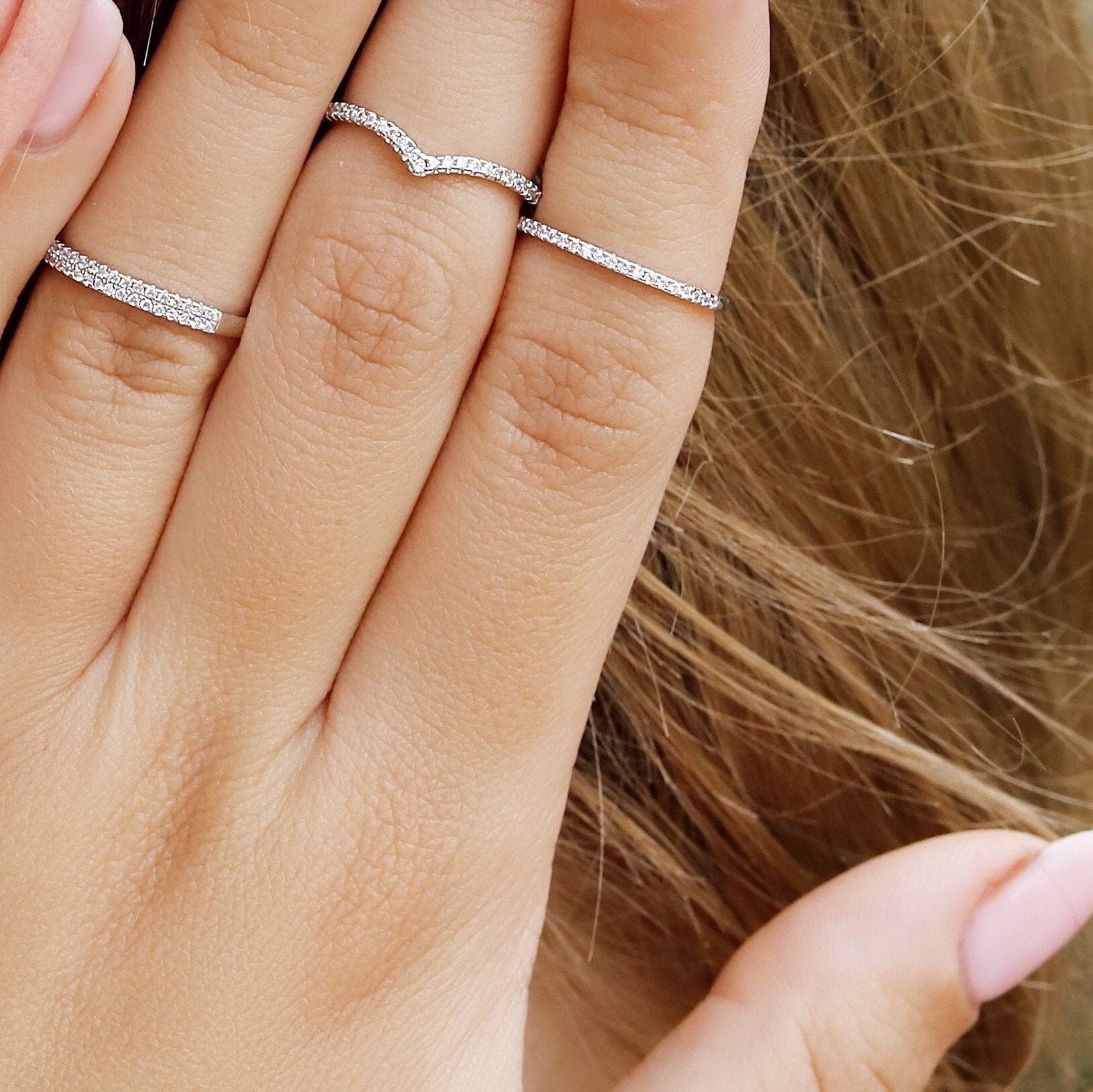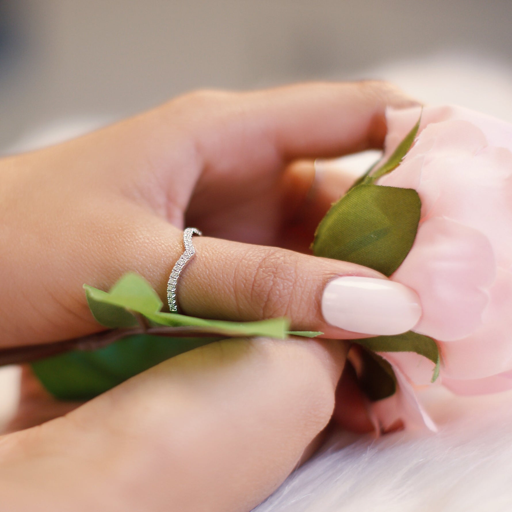 Minimalist in design, this ring dances in the light with clear cubic zirconia accents lining the chevron edges. Plated in rhodium, this ring was made to be stacked for a trendy look and is pairable with Engagement Rings.