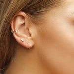 These pair of sterling silver hoops also comes in 18K gold and are undeniably the perfect statement piece to any attire as it is bold and fashion forward, also comfortable and elegant. They are beautiful on their own or can be paired with our baguette huggies too for the ear-party collection or other jewellery.